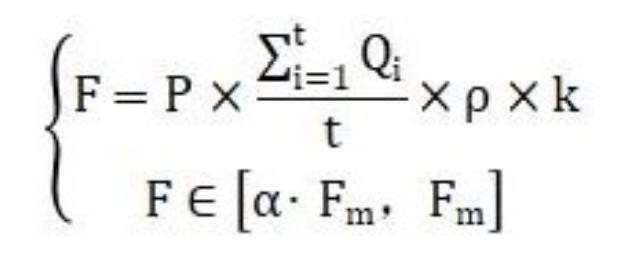其中,F为高压水流冲洗设备实际水流冲洗的冲击力,Qi为高压水流冲洗设备第i秒水流的流量,t为高压水流冲洗设备预设的水流冲洗的时长,ρ为水的密度,k为预设定的阈值参数,P为输出功率可调的高压水流冲洗设备的实际输出功率,α为预设的抗压阈值参数且其数值小于1,Fm为新能源电池冲压配件最大抗冲击力值。
