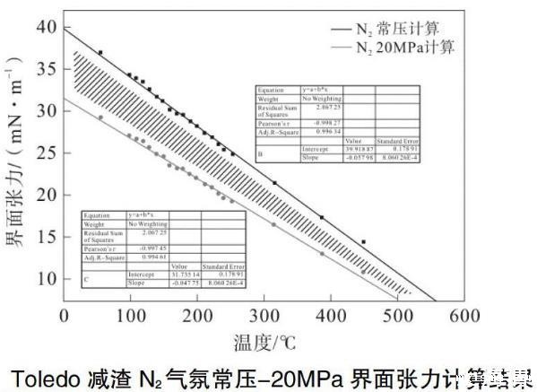 不同温度条件下的线性下降的斜率与温度的变化也基本呈现出一定的的线性。另外,对于不同压力下的界面张力-温度关系,理论上应当都是线性变化,因此,斜率变化的线性变化规律也是符合一般规律的。由此可以推测得到在相应温度条件下的线性下降斜率,从而由N2常压条件下Toledo减渣的界面张力推测得到N2在20 MPa气氛条件下Toledo减渣的界面张力。
