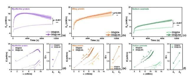 图4.线性粘弹区域内(振幅10%),不同饱和度界面上(a)MP,(b)WP和(c)SC界面膜的弹性模量;(d)MP,(e)WP和(f)SC界面膜的膨胀模量-界面压力关系图。*p<0.05,**p<0.01,***p<0.001