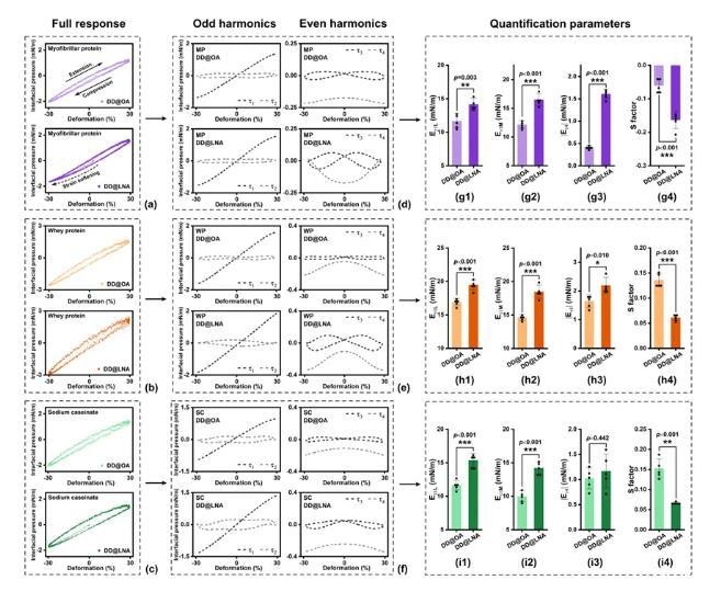 图5.非线性粘弹区域内(振幅30%),不同饱和度界面上(a)MP,(b)WP和(c)SC界面膜的利萨茹图像;通过GSD算法得到的(d)MP,(e)WP和(f)SC利萨茹图像的τ1,τ2,τ3,τ4分解组分;根据τ1,τ2,τ3,τ4计算得到的(g1-g4)MP,(h1-h4)WP和(i1-i4)SC的Eτ1L,Eτ1M,Eτ4模量与S-因子。*p<0.05,**p<0.01,***p<0.001
