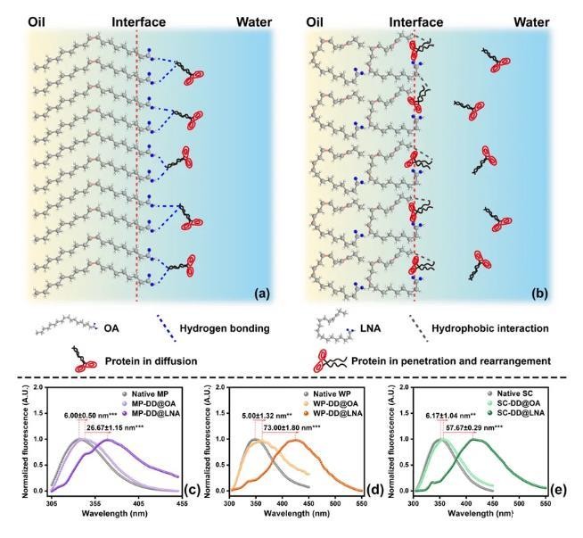 图3.(a-b)油脂不饱和度影响蛋白质界面吸附动力学的机制示意图;界面(c)MP,(d)WP和(e)SC的归一化前表面荧光光谱。*p<0.05,**p<0.01,***p<0.001