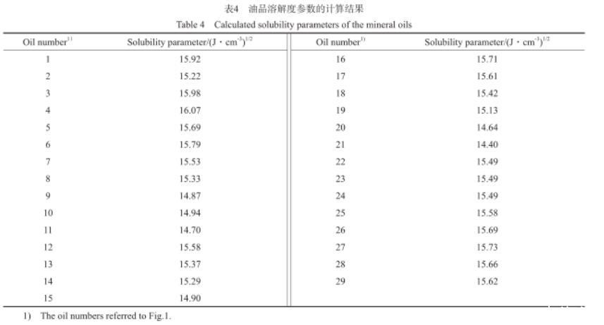 表面张力估算法测定29种常见低芳浅色矿物油的溶解度参数——结果与讨论、结论