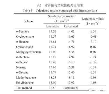 2)由拟合公式计算的11种有机溶剂的溶解度参数与文献值的最大相对误差为2.4%。29种常见的低芳浅色矿物油的溶解度参数计算值为14.40~16.07(J/cm3)1/2,与大部分石蜡基油和环烷基油的溶解度参数值相符,证明基于表面张力的溶解度参数拟合公式具有较好的准确性。