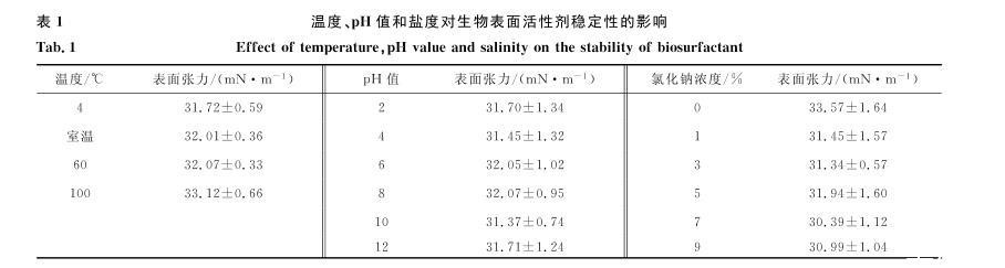 表1温度、pH值和盐度对生物表面活性剂稳定性的影响