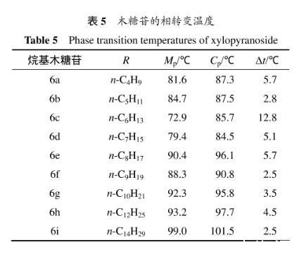 具有液晶特征的化合物因加热而呈现所谓的“双熔融转变”的相变现象,当加热达到其熔点(p)时,结晶性的固态首先转变成半透明的液晶态,接着在较高的温度(p)下转变成各向同性的清亮的液态。表5所示为木糖苷的相转变温度。从表5可见:烷基-β-D-吡喃木糖苷属于一头一尾(one head one tail)或一头组一链(one head group-one chain)且呈现多态性的双亲吡喃糖苷分子,在加热时其相变发生在相对较小的温度区间,但都出现了液晶相,且当疏水性烷基碳链长度为6时,烷基-β-D-吡喃木糖苷相变温度之差(Δ)较大,其他的都比较接近。在木糖苷中,烷基有助于提升分子取向的稳定性,且这种稳定性对液晶相的生成是必要的。但由于烷基-β-D-吡喃木糖苷为环状的糖苷只有3个游离羟基,比烷基--D-吡喃葡萄糖苷少了亲水性头部的糖环上的羟甲基,也比木糖醇的十二烷基单醚少了1个游离的羟基,清亮点p不高,所以,得到的烷基-β-D-吡喃木糖苷具有液晶相,但相变温度范围(∆=p−p)较窄,液晶相的稳定性较弱。