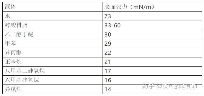 常见液体物质的表面张力