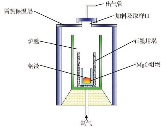 将重轨钢铸坯切成20 mm×15 mm×10 mm的钢块并打磨氧化皮,每炉试验取约300 g钢块叠放在MgO质量分数为99.5%的坩埚中,并随石墨坩埚一同放置在管式电阻炉中,调好程序缓慢加热升温,试验装置如图1所示。当温度升至600℃时,氩气(质量分数为99.99%)流量控制为2.5 L/min,保持坩埚内中性气氛,当温度升至900℃时,氩气流量调整为3.5 L/min,炉膛升温至1 600℃后持续保温30 min以保证钢液熔化且均匀。