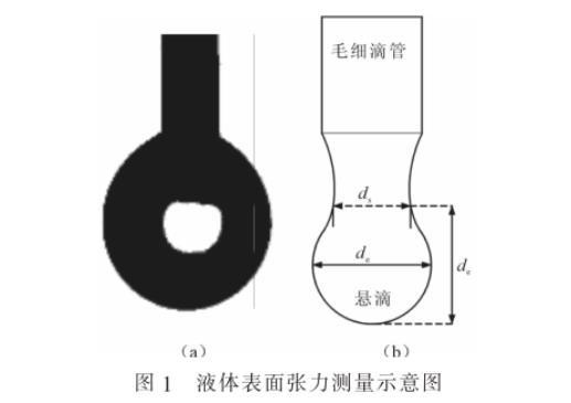 笔者采用液体表面张力的测量方法为悬滴法,即通过测量悬挂着的液滴的外形参数而推算出液体表面张力,如图1所示。在憎水角测试仪配套的微量进样器中滴出液滴,拍摄液滴照片,读取液滴形态参数的像素值,根据测量滴管的实际尺寸和像素值,获得像素值和实际尺寸的比例,换算实际液滴的尺寸参数,并根据公式推算表面张力。