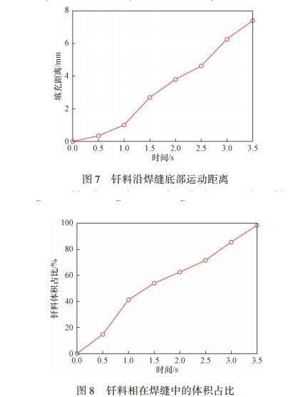 液态钎料沿着焊缝下表面的填充距离如图7所示。前1s内,钎料未润湿焊缝下表面,曲线上表示为钎料竖直向下运动的距离,此时铺展速度较为缓慢。当钎料直接接触焊缝下表面时,驱动力增强,加速了钎料的铺展。焊接过程中可能会出现微小气泡从而影响焊接强度,故统计了焊缝内不同时刻下钎料体积占总体积的比值(图8)。在t=1s之前,前沿流动速度较小,但由于填充截面面积较大,总体铺展速度仍处于较高的水平。当钎料开始向两侧流动,铺展速度略微下降。最终得到的钎料填充体积占比达到98.5%,表明焊缝填充效果良好。