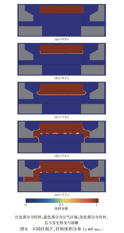 整个计算过程内的两相体积分布如图6所示。根据图6可以看出焊缝内不同时刻下的钎料运动状态。固态钎料温度缓慢上升,当底部钎料达到熔点后开始融化,出现自由液面。钎料在表面张力和重力的作用下流入焊缝,整齐向下方流动,铺展过程较为缓慢。t=1.0s时,液态钎料开始沿着焊缝通道向两侧运动,由于计算模型的限制,部分气体未及时排出,在壁面上黏附形成许多虚假小气泡。t=2.0s时,由于毛细力的作用,壁面附近的钎料运动快于中心位置,由此形成了“凹”形的流动前沿。当t=3.2s时,焊缝被钎料完全填充,流场达到稳定状态,但焊缝上方表面的两个角点直接暴露在空气中,故该位置处的钎料填充效果略差。