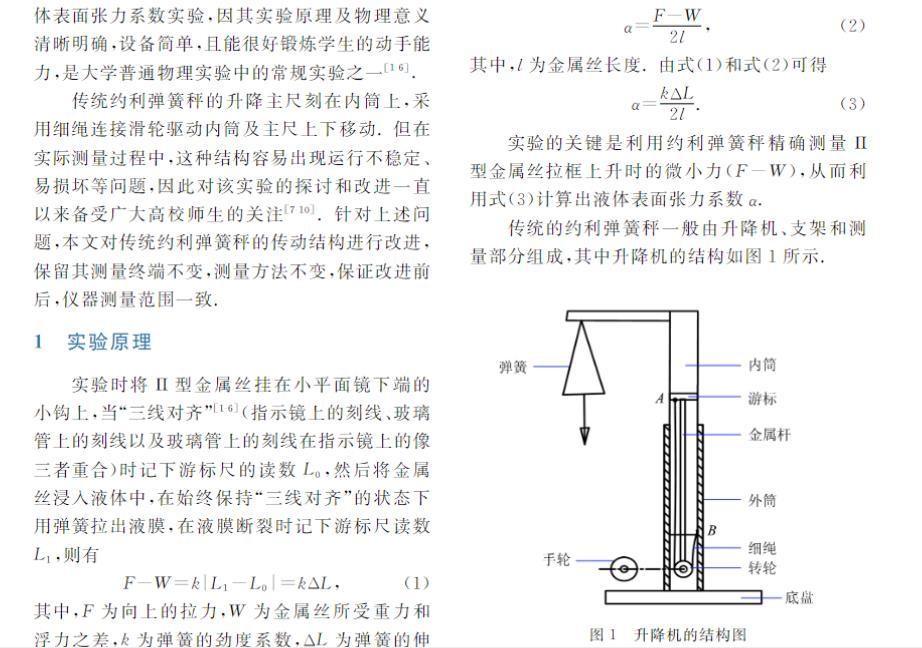 约利弹簧秤是一种精细弹簧秤,常用来测定微小的力。利用约利弹簧秤采用拉脱法测量液体表面张力系数实验,因其实验原理及物理意义清晰明确,设备简单,且能很好锻炼学生的动手能力,是大学普通物理实验中的常规实验之一。