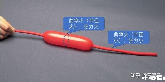 气球内部的气体压力处处相等,但是,接触过这种气球的人都有一个经验,就是粗的地方绷得紧,而细的地方绷得就不那么紧。如上图所示,绷得紧的地方和绷得松的地方,产生的压力差是相等的,但是他们的曲率是不相等的:曲率越大,同样的张力所能产生的压力差就更大。