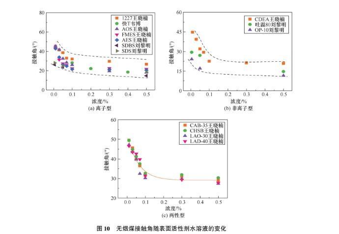 图10无烟煤接触角随表面活性剂水溶液的变化