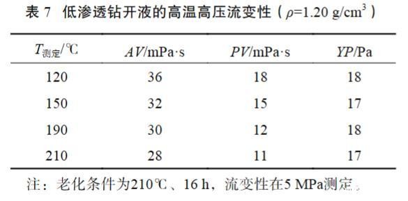 表7低渗透钻开液的高温高压流变性(ρ=1.20 g/cm3)