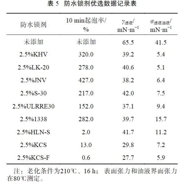 前期钻井作业期间,钻开储层前低渗透钻开液体系中加入了防水锁剂材料,发现加入后出现了起泡问题,加入消泡剂后有一定效果但是循环和再加入防水锁剂时又会出现起泡情况,一定程度上影响了正常作业。另外,由于起泡问题,会将空气中氧气携带进入钻井液中,在井底高温环境中会加速钻井液中聚合物材料的降解。为了解决起泡问题,同时预防低孔低渗储层的水锁伤害,室内开展超高温低渗透钻开液体系配套防水锁剂优选试验。