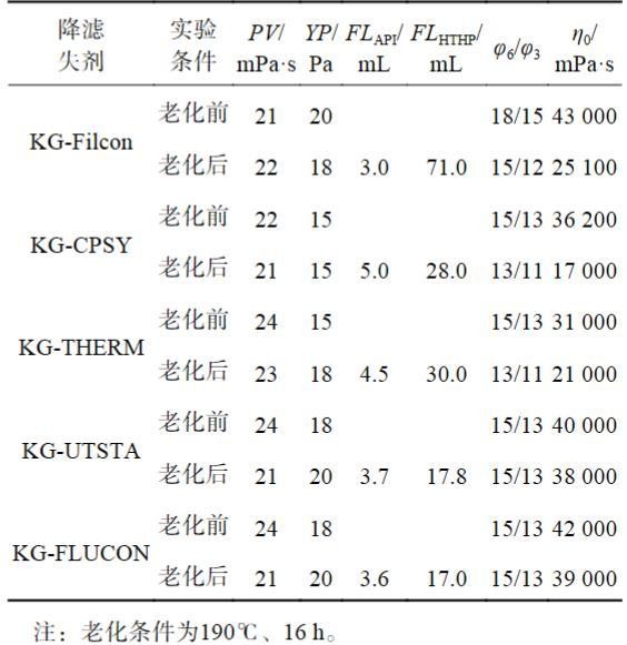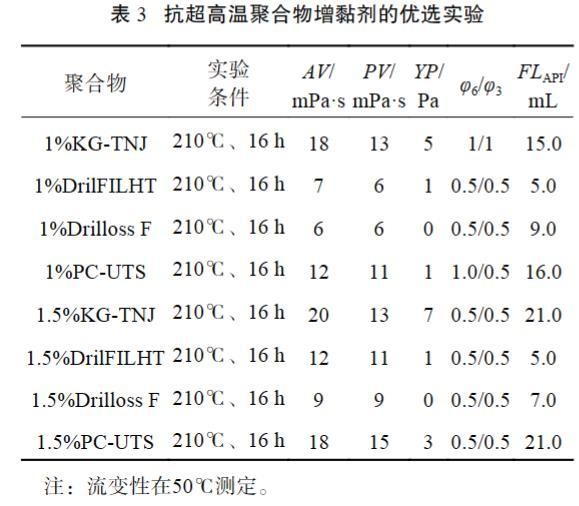 室内对4种高温聚合物增黏剂材料进行了单剂抗温性能对比评价。其中KG-TNJ为温敏疏水缔和聚合物提黏剂,DrilFILHT为纳米片状氧化镁酚醛树脂改性聚合物增黏降滤失剂材料,Drilloss F为纳米微球聚合物复合增黏聚合物材料,PC-UTS为某国外代表性高温聚合物材料。评价配方:基础配方+2.5%KG-UTSTA+聚合物,实验结果见表3。