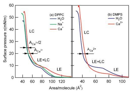 图2:DPPC(A)和DMPS(b)在不同亚相上的压力面积(π-A)等温线:净水(蓝色)、1 M NaCl溶液(绿色)、1 M CaCl2溶液(红色)。沿等温线显示了液相膨胀相(LE)、液相凝聚相(LC)和两相共存区(LE+LC)。ACa2+代表钙离子的面积。