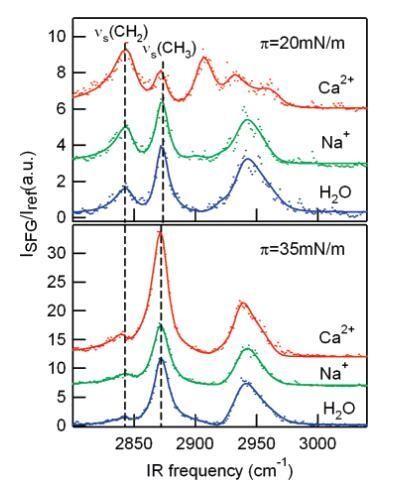 振动和频发生光谱学(VSFG)。VSFG是一种非线性振动光谱技术,可提供界面分子构象顺序和方向的表面特定信息,进一步研究了在Ca2+存在下这种改变相行为的分子起源。21,22为了量化离子对脂质尾部构象的影响,在C-H拉伸区域收集VSFG光谱。沿等温线测量了几个表面压力的光谱;图5显示了DPPC单层在20 mN/m和35 mN/m下三种不同亚相的光谱。可以观察到五种振动模式:以2876、2970和2938 cm-1为中心的峰值分别归属于CH3对称拉伸、CH3反对称拉伸和CH3费米共振。22 CH2对称和反对称拉伸频率约为2846和2920 cm-1。氘化DPPC脂质单层(d62和d75 DPPC)上的VSFG实验显示胆碱C-H伸展的信号非常低。