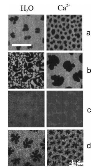 图3:水上DPPC(a、b、c)和DMPS(d)单层的荧光图像(左图)和1 M CaCl2溶液(右图),π)4 mN/M(a)、π)6.5 mN/M(b)、π)35 mN/M(c)和π)2 mN/M(d)。单分子膜用5 mol%罗丹明PE标记:亮区对应于LE相,暗区为LC结构域。比例尺代表15µm。所有图像的对比度都相同。
