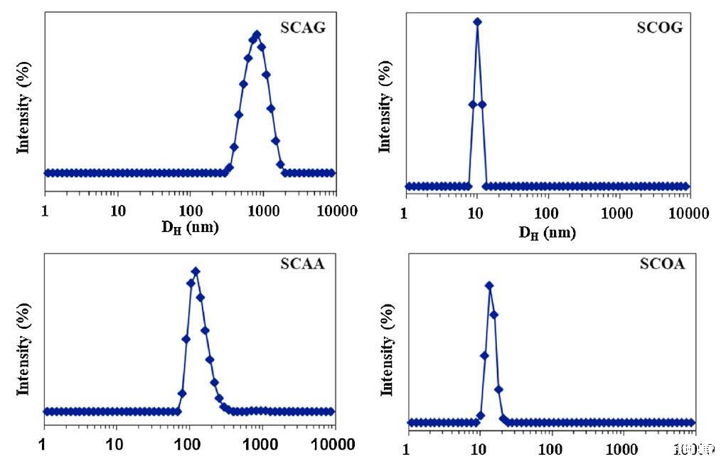 用DLS测量在6种酰基氨基酸表面活性剂水溶液中形成的聚集体的大小和分布,其CMC为5倍,5×CMC。图2显示了它们的表观等效流体动力学直径(DH)。除丝氨酸外,蓖麻油表面活性剂的DH分布普遍大于棉籽油表面活性剂的DH分布。SCAG和SCAA的DH分布分别集中在900和150 nm,而SCOG和SCOA聚集体的直径约为10 nm。对于丝氨酸,SCAS和SCOS的平均DH值分别约为100 nm和250 nm。这些结果可以通过蓖麻油衍生的表面活性剂的蓖麻油基和丝氨酸头部基团上都存在-OH基团来解释,促进了大聚集体,例如囊泡的形成(图2)。