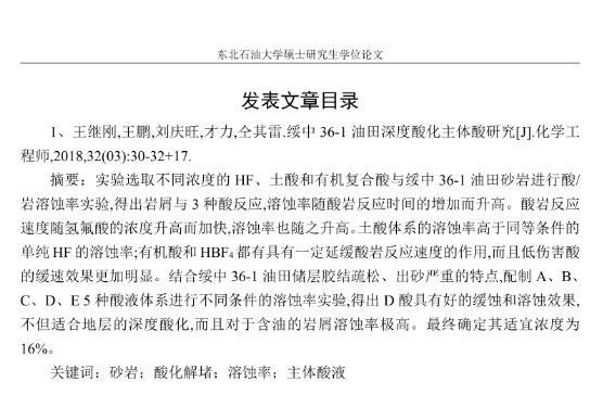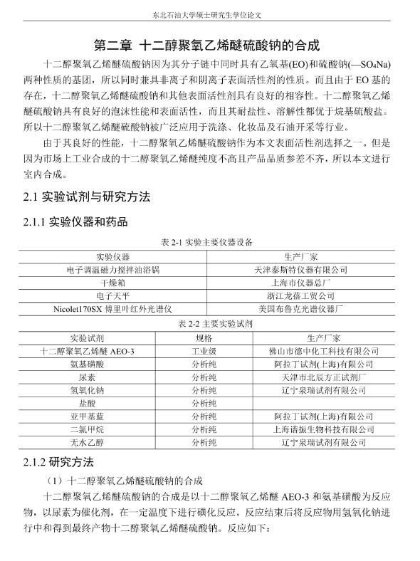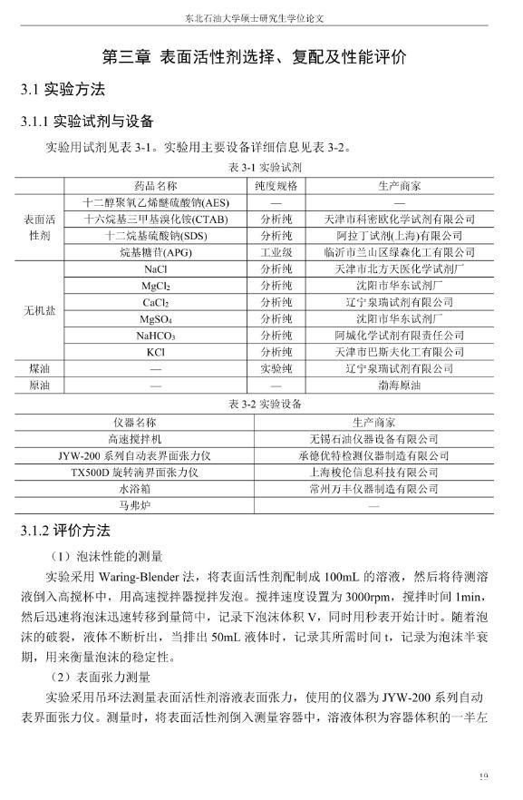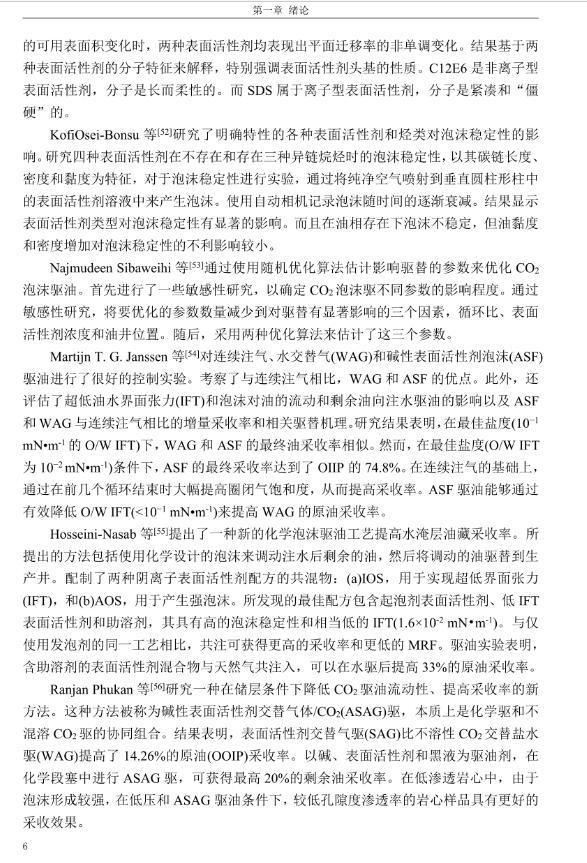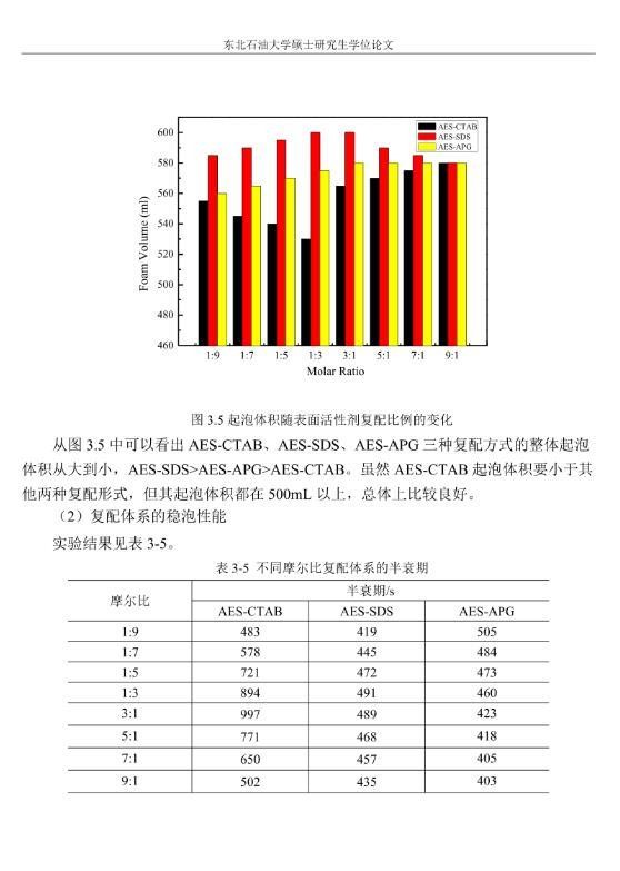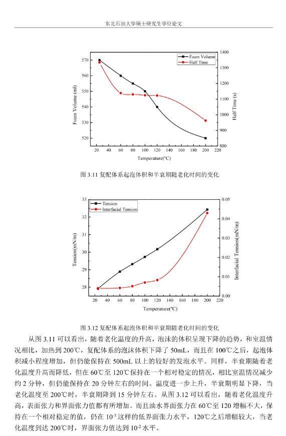 【摘要】:泡沫驱具有良好的驱油性能,在提高采收率方面备受关注。在泡沫驱油过程中,能够明显降低注入流体的流度,改善流度比,降低流体的相对渗透率,延缓注入流体的突破时间,封堵高渗层的大孔道,改变液流的方向,较好地实现封堵作用。但泡沫作为一种热力学不稳定流体,其稳定性受许多因素的影响,包括遇油快速消泡、在高温和高矿化度的情况下极易破裂等,泡沫稳定性已成为泡沫驱油时亟待解决的问题。另外,用于泡沫驱的泡沫体系很难兼具超低界面张力和稳定泡沫两种性能,而且文献报道对这方面的研究较少,这为本文提供了一个新的思路。实验室合成阴-非离子型表面活性剂十二醇聚氧乙烯醚硫酸钠(AES)。AES同时具有阴离子和非离子两种表面活性剂的性能,具有很好的泡沫性能和表面活性,同时与其它表面活性剂具有很好的相容性。最终确定的合成条件为:十二醇聚氧乙烯醚和氨基磺酸的摩尔比为1:2,反应温度为95℃,反应时间为60min。在合成AES的基础上,选择几种不同类型的表面活性剂进行复配,优选出泡沫性能和表面活性优良的体系,进行耐温、耐矿化度及耐油性能的评价。实验采用Waring-Blender法测量泡沫的起泡体积和半衰期,采用吊环法和旋转滴法测量复配体系的表面张力与油水界面张力。实验最终优选出泡沫性能与表面活性优良的AES-CTAB复配体系,并确定其最佳复配摩尔比为3:1,最佳总浓度为0.02mol·L-1。复配体系耐温200℃,耐质量分数20%的原油,矿化度增加可以提高复配体系的泡沫稳定性和表面活性。实验从气液比、泡沫注入量和温度三个方面对泡沫提高采收率的影响进行研究。最佳气液比为2:1,最佳泡沫注入量为0.6PV,泡沫采收率随温度的提高逐渐下降,在60-100℃范围内泡沫在水驱后提高采收率在30%以上。