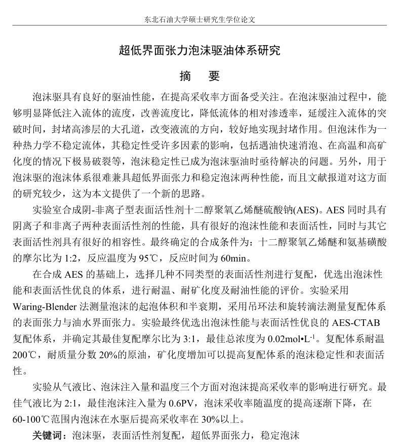 超低界面张力泡沫驱油体系研究