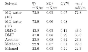 下表列举了几种广为人知的溶剂的表面张力数据来阐述了Kibron传感器的准确性和精确性,每种溶剂都连续测定5次并且利用常规的统计学方法来分析相关数据。对表面张力的均值进行了一个比较,结果和文献值是相一致的。